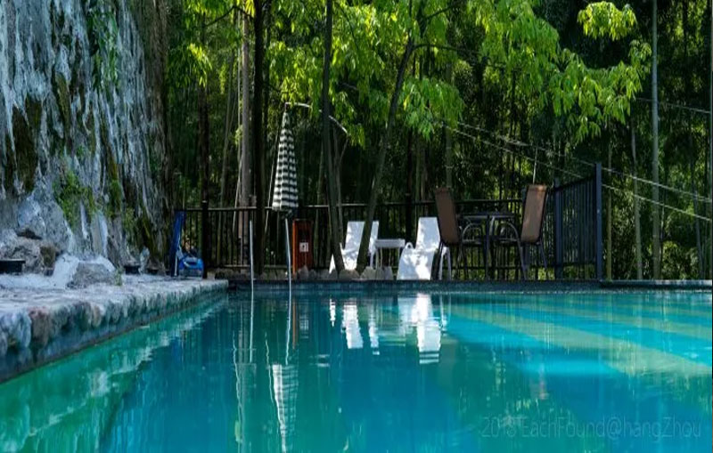 正值六月,就想脱了鞋子到溪水里玩耍,管家早已在门口等,让先去上面休息一下。民宿的一楼院子里,有几株大大的芭蕉树,很是养眼。无边游泳池的水整排如珍珠垂落,形成一幕水墙,凉快之气迎面而来。