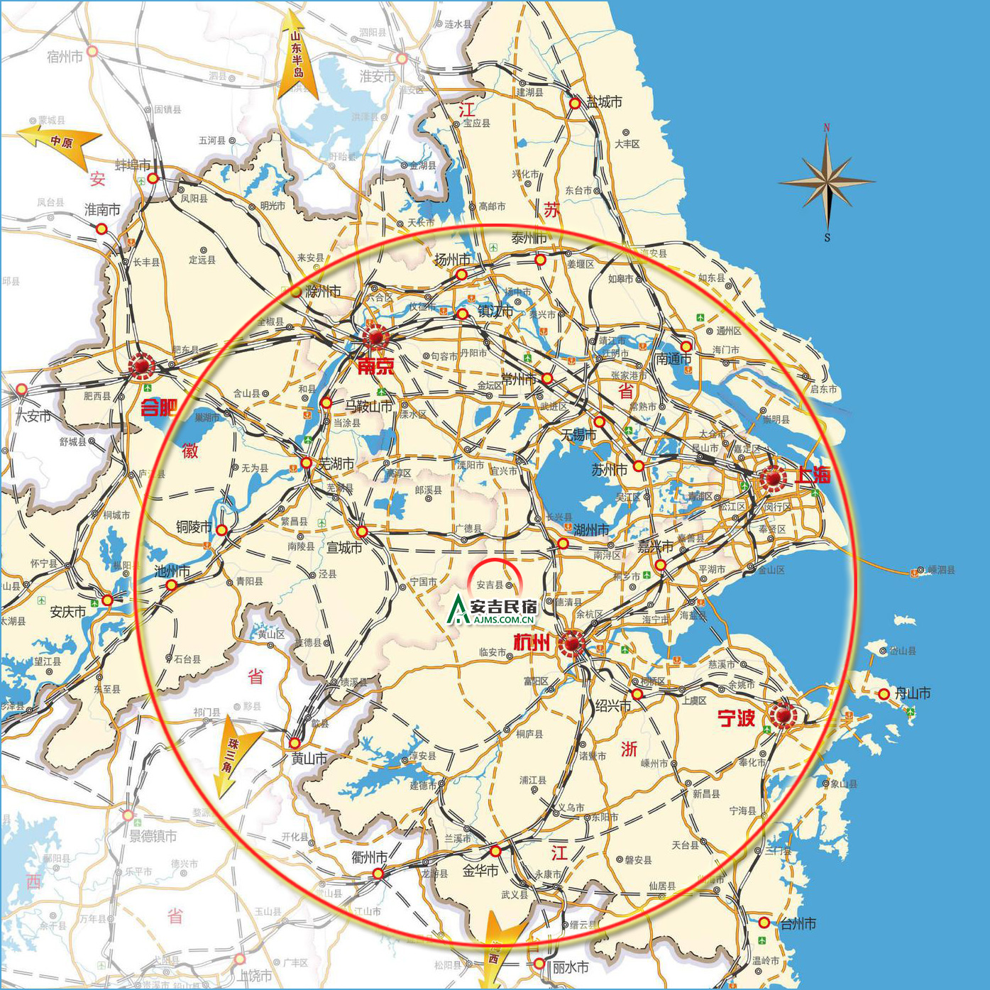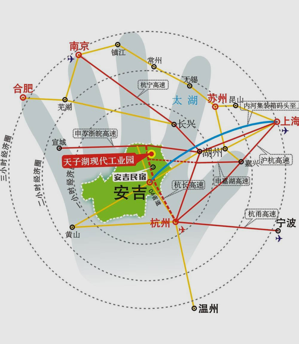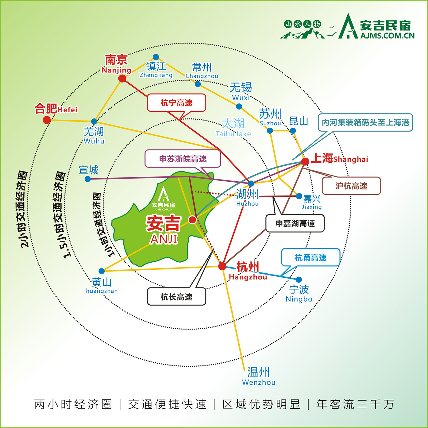 安吉地处长三角地区的几何中心,高速互通,交通便捷,距离杭州紫金港收费站只有半小时车程;申嘉湖高速至安吉孝源段已于2019年7月通车,实现2小时到上海的高速直达;商合杭高铁将于2021年通车;安吉至杭州的城际轻轨建设已列入《杭州市城市总体规划(2001-2020年)》。杭州、上海经济圈,超人气民宿火爆成交,年客流三千万。