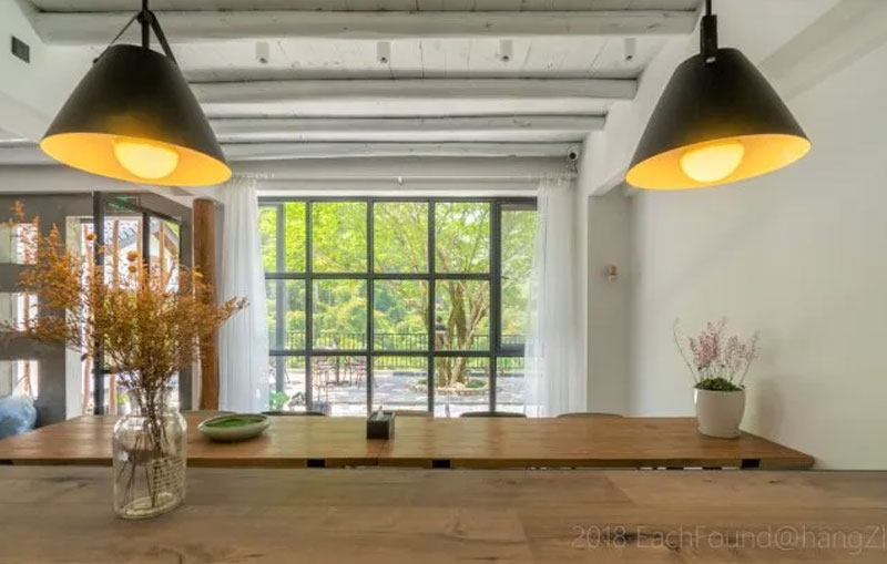正值六月,就想脱了鞋子到溪水里玩耍,管家早已在门口等,让先去上面休息一下。民宿的一楼院子里,有几株大大的芭蕉树,很是养眼。无边游泳池的水整排如珍珠垂落,形成一幕水墙,凉快之气迎面而来。
